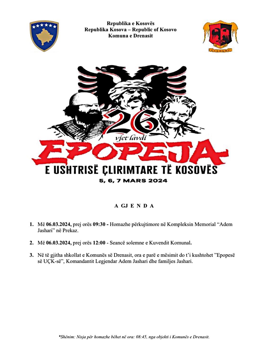 Agjenda e Komunës së Drenasit me rastin e 26 vjetorit të Epopesë së Lavdishme të Ushtrisë Çlirimtare të Kosovës, 5, 6 dhe 7 mars