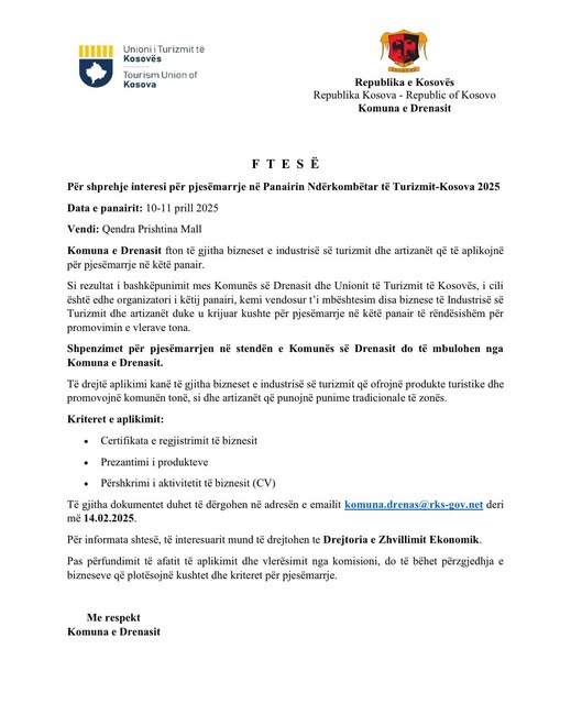Komuna e Drenasit fton të gjitha bizneset e industrisë së turizmit dhe artizanët që të aplikojnë për pjesëmarrje në këtë panair.