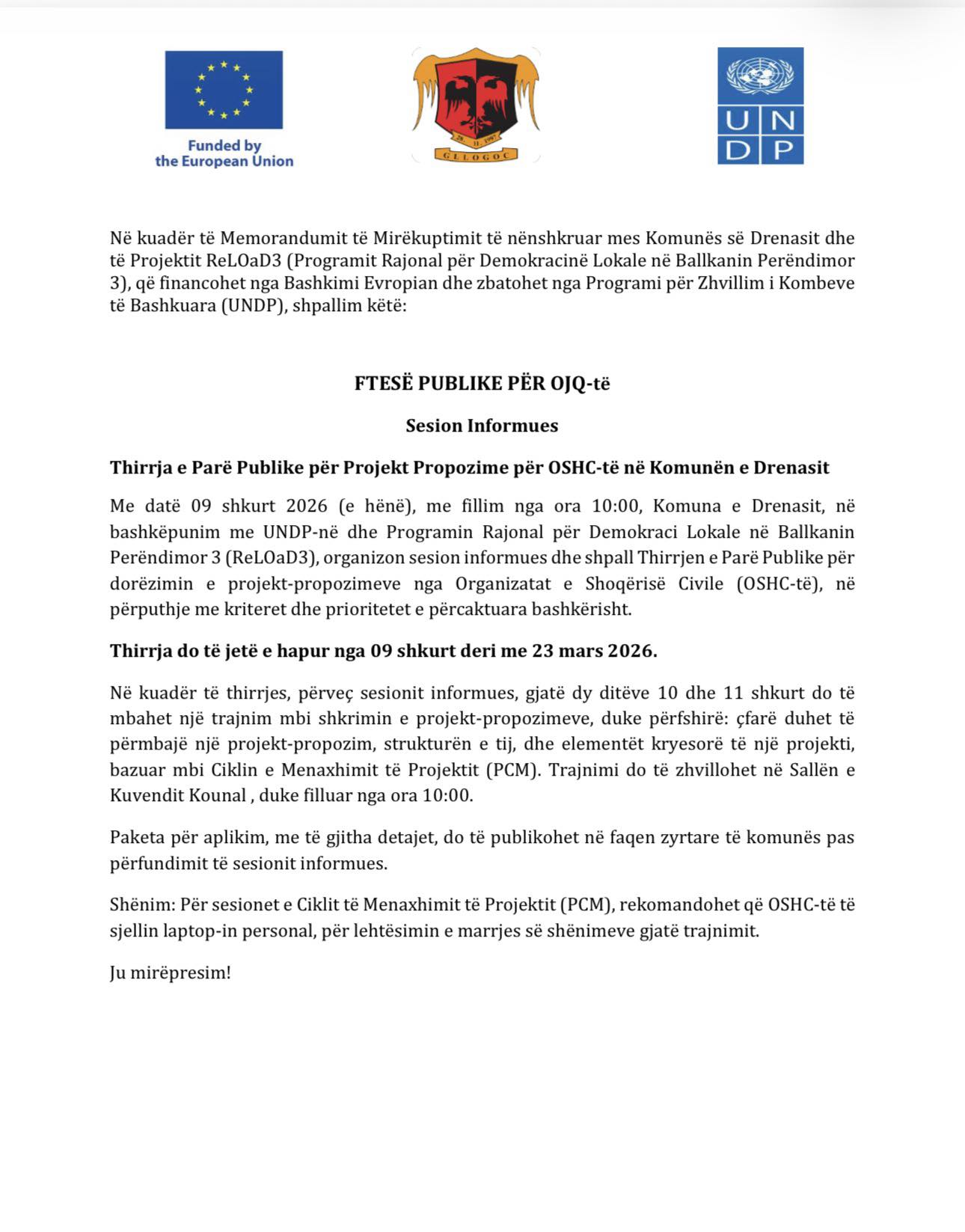 Komuna e Drenasit, në bashkëpunim me UNDP dhe Programin Rajonal për Demokraci Lokale në Ballkanin Perëndimor 3 (ReLOaD3), shpall Thirrjen e Parë Publike për dorëzimin e projekt-propozimeve nga Organizatat e Shoqërisë Civile (OSHC-të).